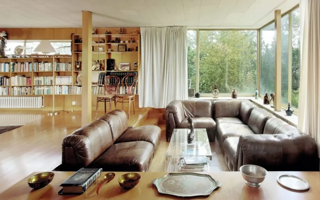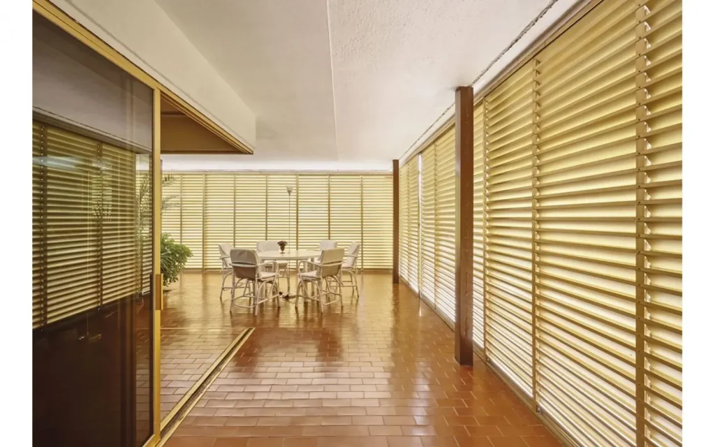 El interior de la casa se diseña pensando en la relación con el jardín y el paisaje que el arquitecto persigue como criterio rector del proyecto. Puertas y ventanales acristalados abren los espacios interiores a las terrazas exteriores, que sirven de zonas sombreadas de tránsito hacia el jardín.